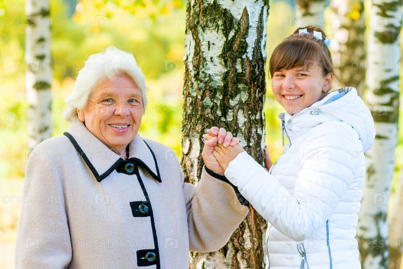 Пожилая женщина с внучкой гуляют в осеннем парке