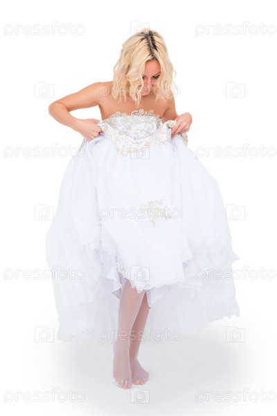 Невеста смотрит на свои ноги под подолом