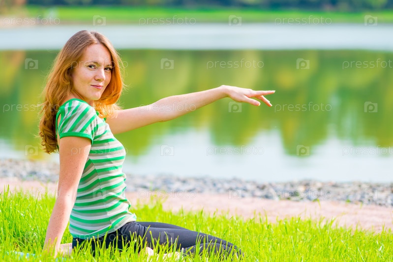 Красивая женщина показывает на что-то
