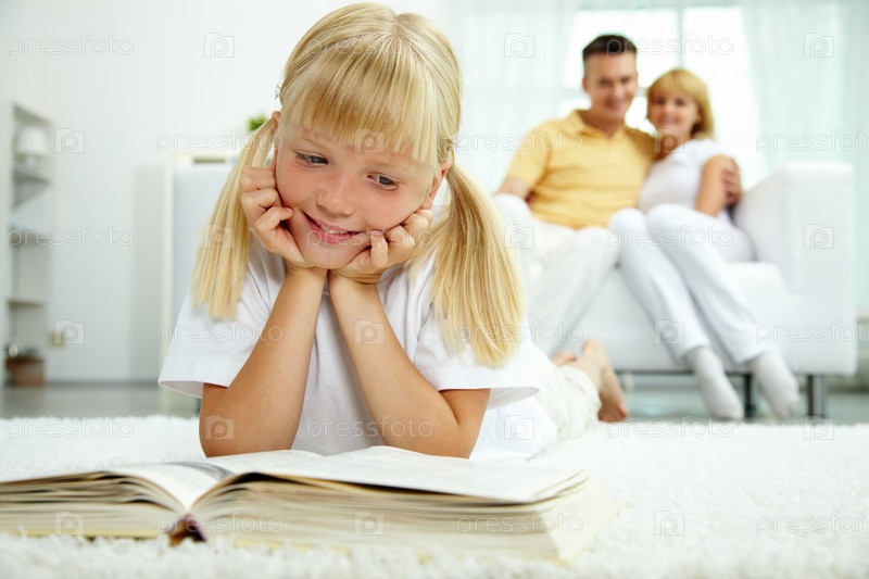 Дочка читает книгу на фоне родителей, сидящих на диване
