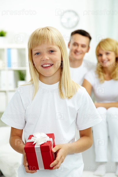 Девочка с подарком на фоне родителей, сидящих на диване