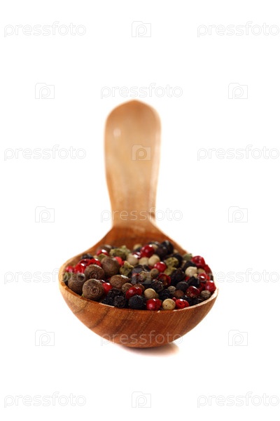 Микс из пяти перцев в деревянной ложке на белом фоне