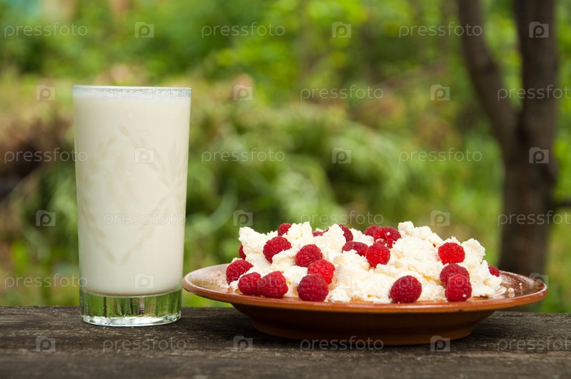 Творог с малиной и стакан молока