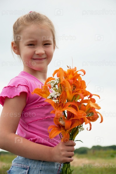 Девочка с букетом оранжевых лилий