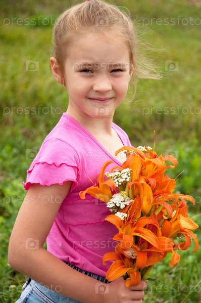 Девочка с букетом оранжевых лилий
