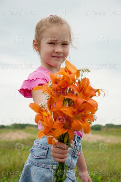 Девочка с букетом оранжевых лилий