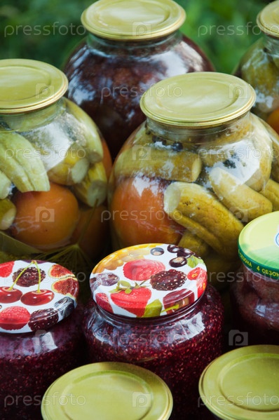 Банки с консервированными овощами и вареньем