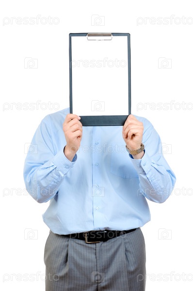 Бизнесмен держит клипборд, изолированный на белом фоне