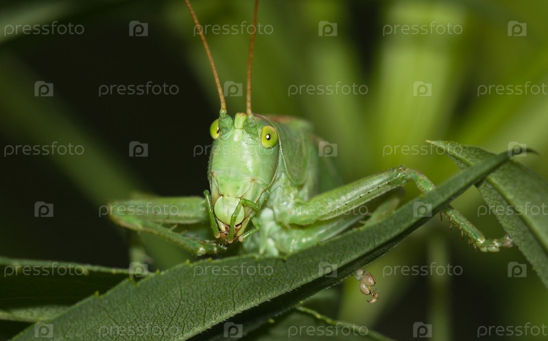 Большой зеленый кузнечик сидит на травинке