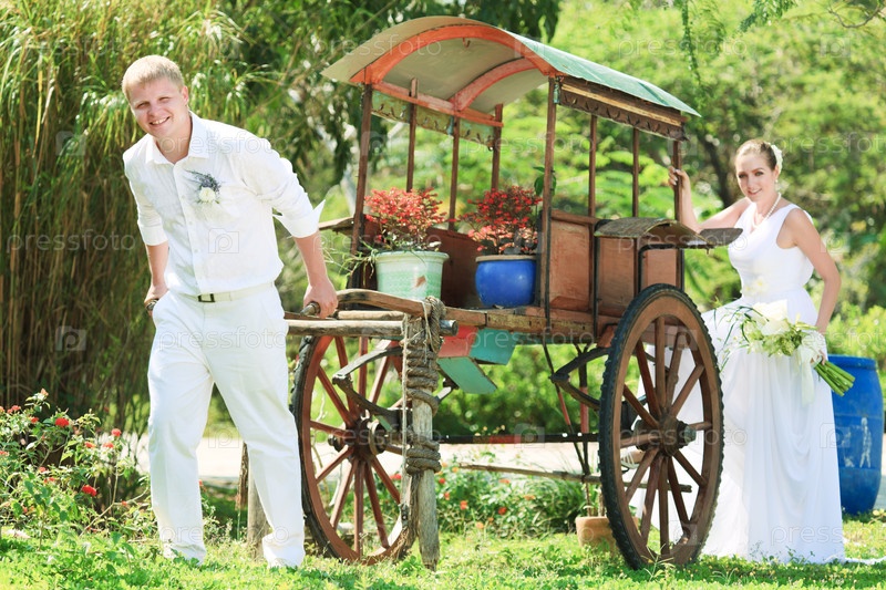 Молодожены с цветочной телегой