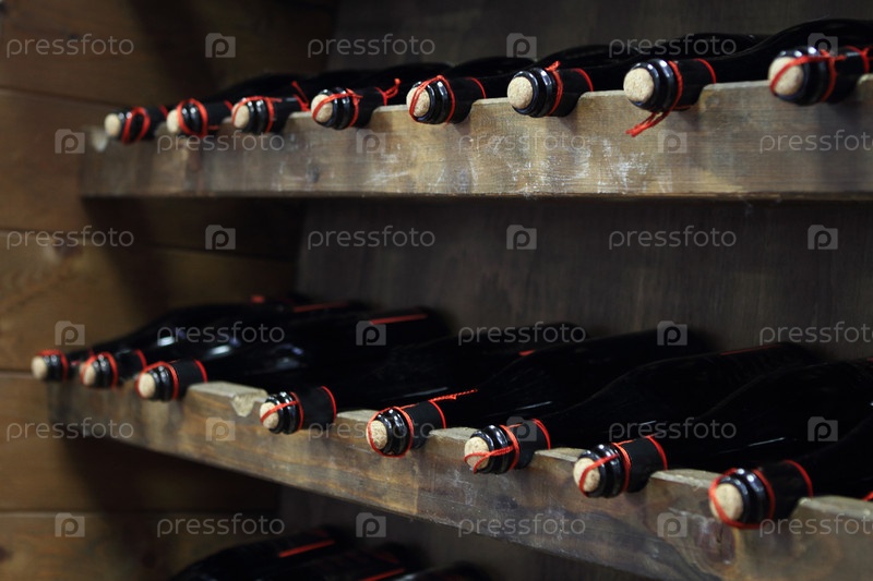 Бутылки красного вина лежат рядами в винном погребе