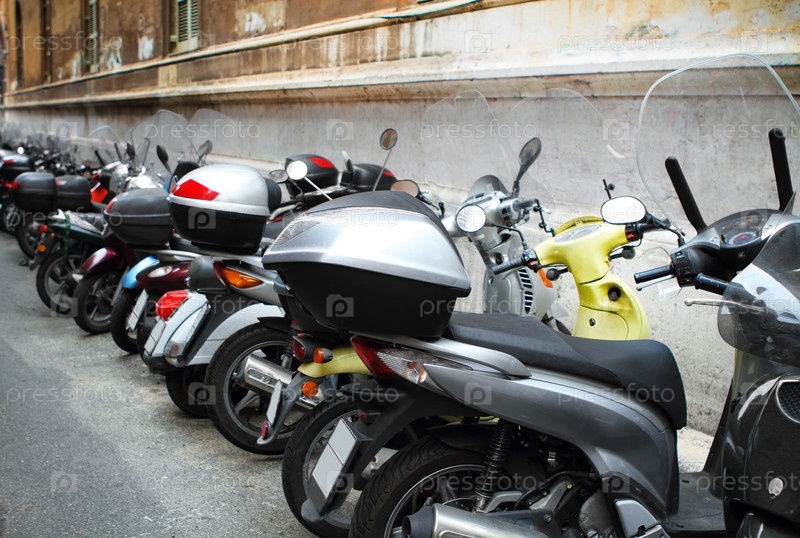 Ряд припаркованных мотоциклов на узкой итальянской улице. Рим