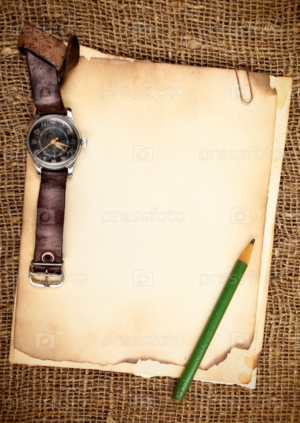 Шаблон со старыми обгоревшими листами бумаги, наручными часами и карандашом