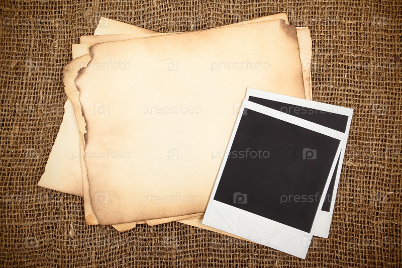 Шаблон со старыми обгоревшими листами бумаги и фотокарточками