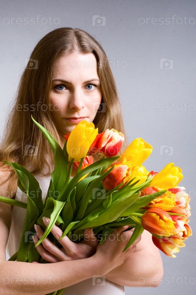 Девушка, держащая букет тюльпанов
