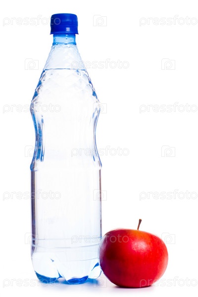 Яблоко и бутылка с водой, изолированные на белом фоне