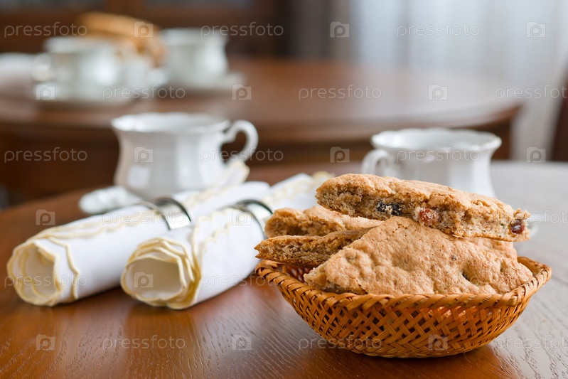 Печенье, чашки и салфетки на деревянном столе