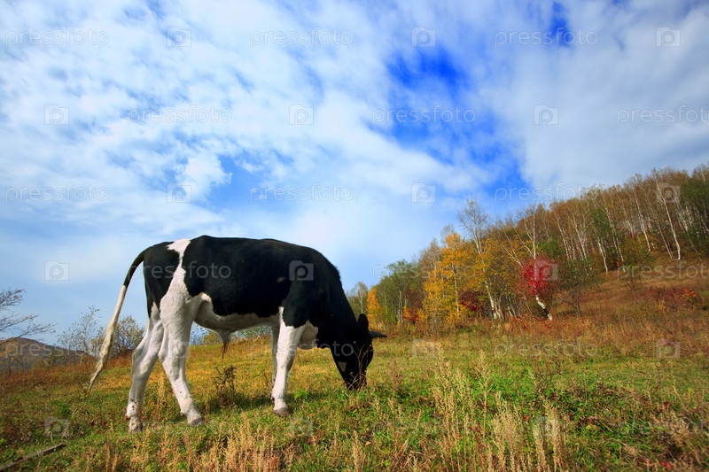 Бык, пасущийся возле леса
