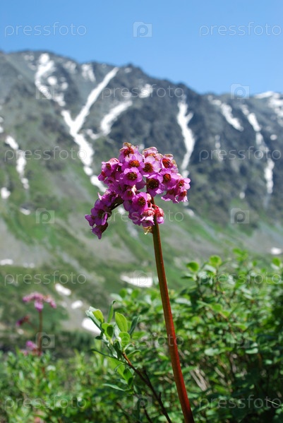 Цветущий бадан на фоне гор (Bergenia crassifolia)