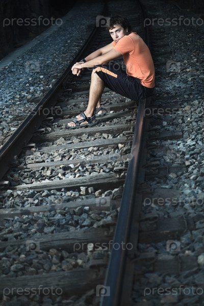 Молодой симпатичный мужчина сидит на рельсах ночью