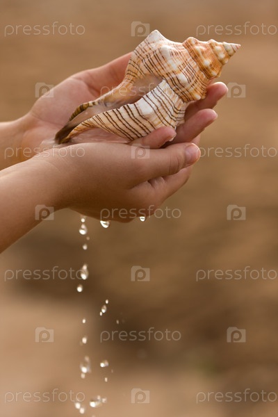 Руки держат морскую раковину с капающей водой