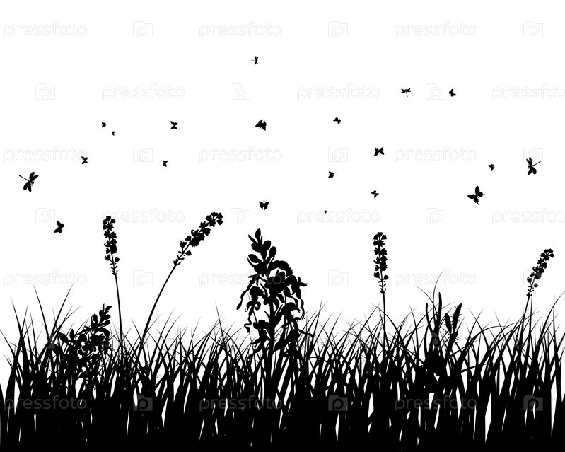 Черные силуэты травы и бабочек на белом фоне