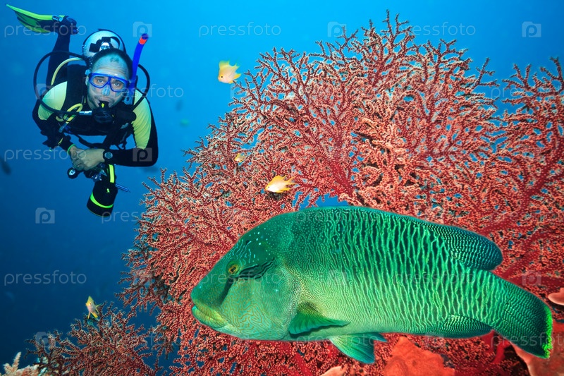 Подводный пейзаж с аквалангистом, кораллами и тропическими рыбками