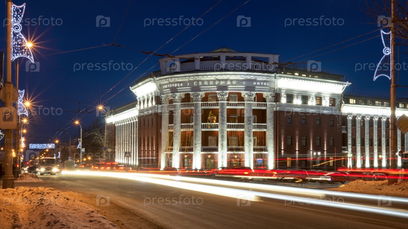 Вечерний Петрозаводск зимой, вид на гостиницу Северная