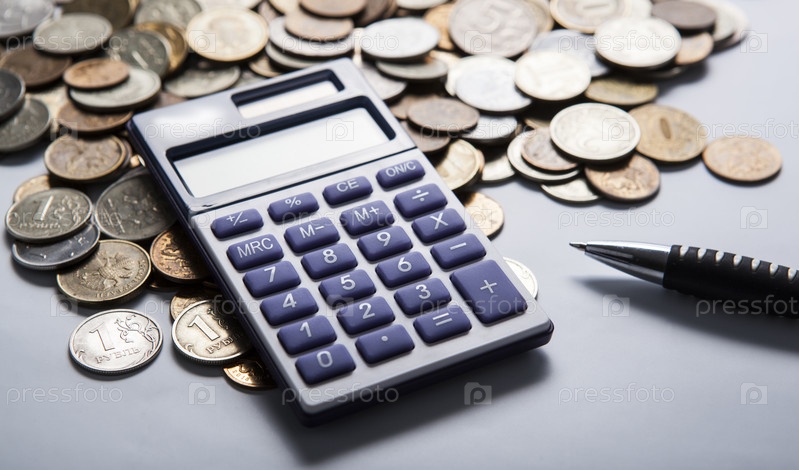 Горсть российских рублей с калькулятором