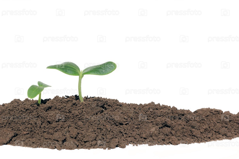 Ростки огурца в земле на белом фоне