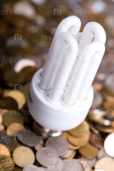 Энергосберегающая лампа на фоне монет
