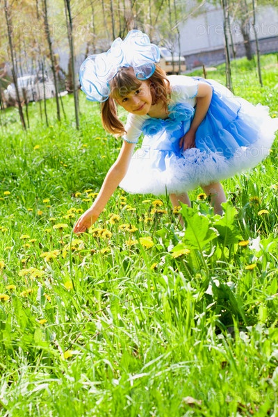 Девочка в нарядном платье играет на лугу