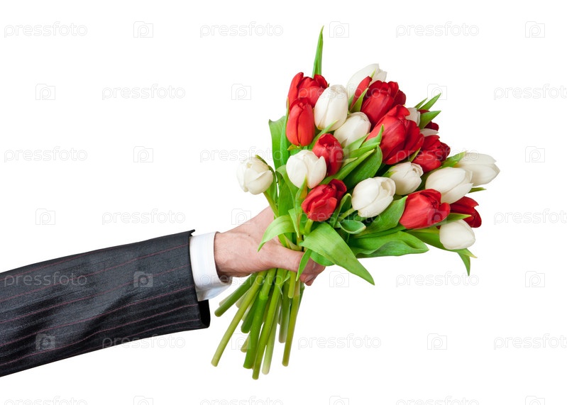 Рука держит букет тюльпанов на белом фоне