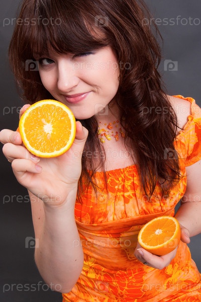 Улыбающаяся девушка на сером фоне с апельсинами в руках