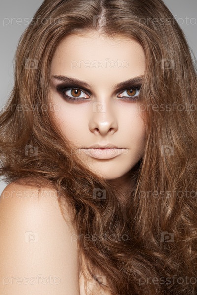 Портрет темноволосой девушки на сером фоне