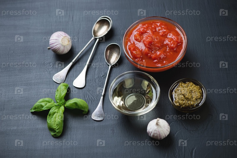 Соус песто, томаты, оливковое масло и чеснок