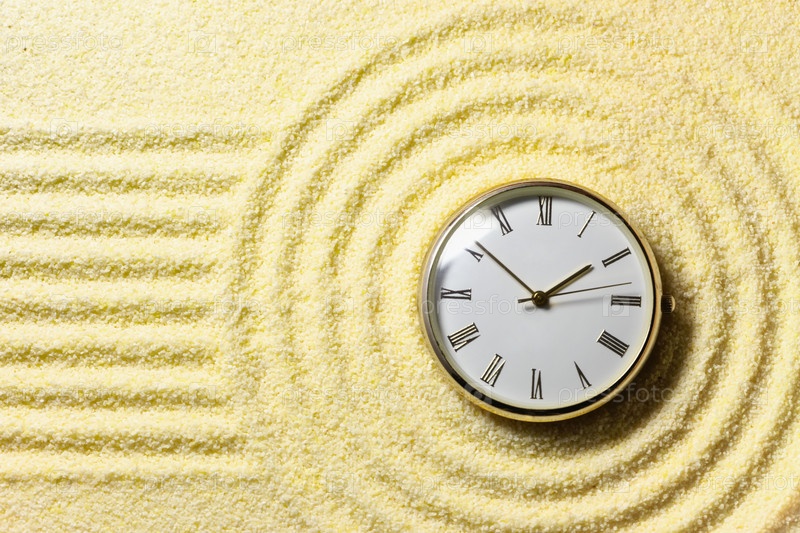 Композиция на Дзен-саду - желтый песок и часы