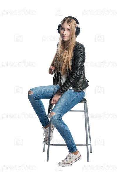 Девушка в проводных наушниках на белом фоне