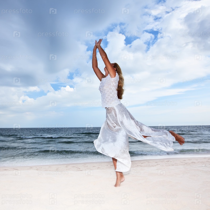 Молодая женщина в белом танцует на пляже