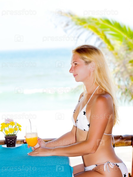 Женщина пьет сок в ресторане на пляже