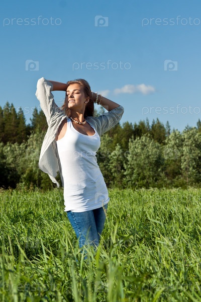 Красивая молодая девушка стоит в траве