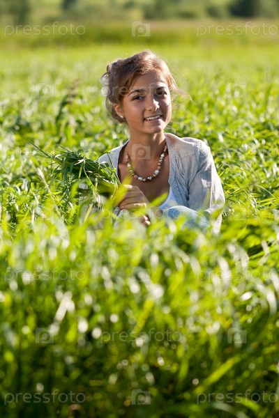 Красивая молодая девушка сидит в траве