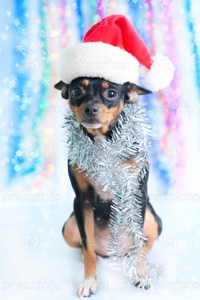 Собака в мишуре и шапке Санта-Клауса