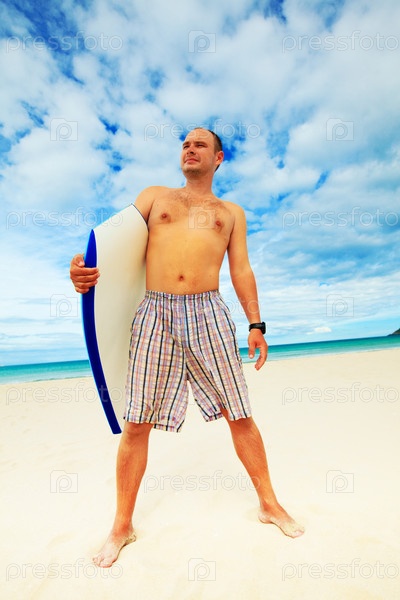 Мужчина с доской для серфинга на тропическом пляже