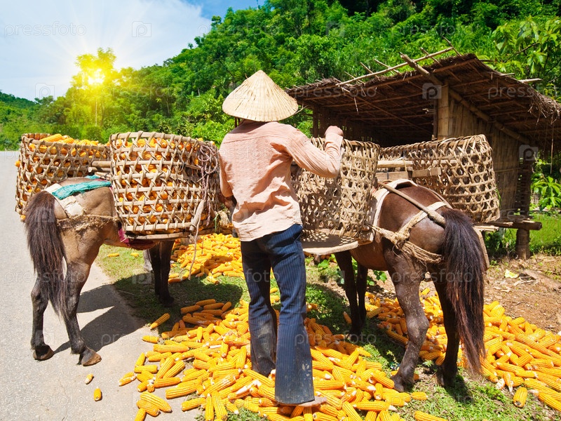 Две лошади с полными корзинами кукурузы