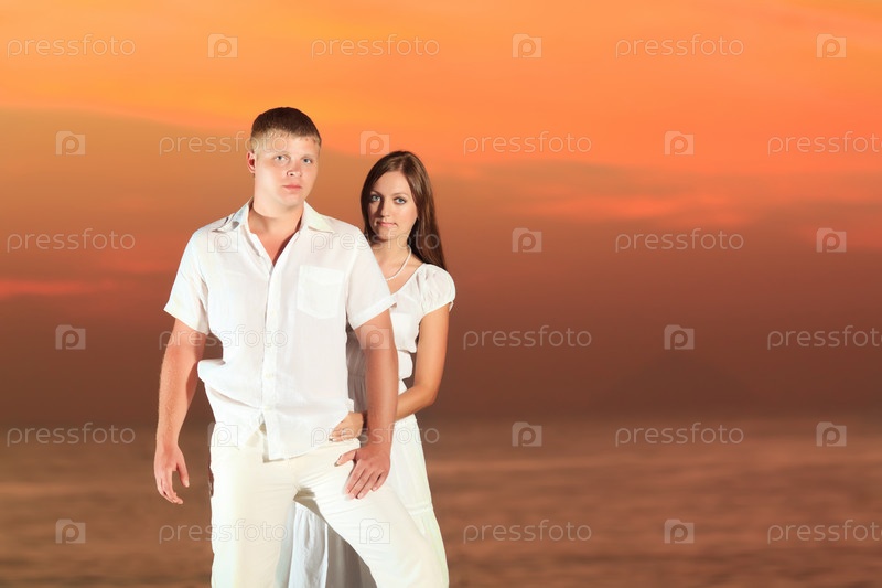 Молодая пара на фоне океана во время заката