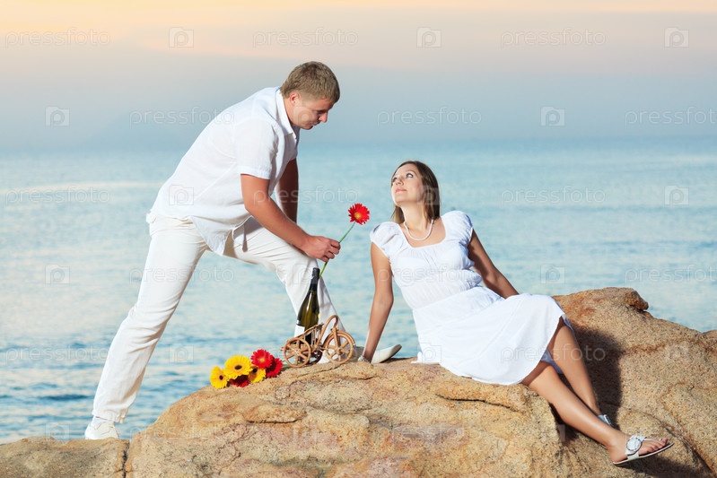 Молодая пара на фоне океана во время рассвета