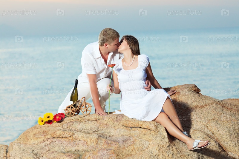 Молодая пара на фоне океана во время рассвета