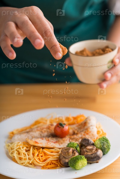 Повар посыпает блюдо специями