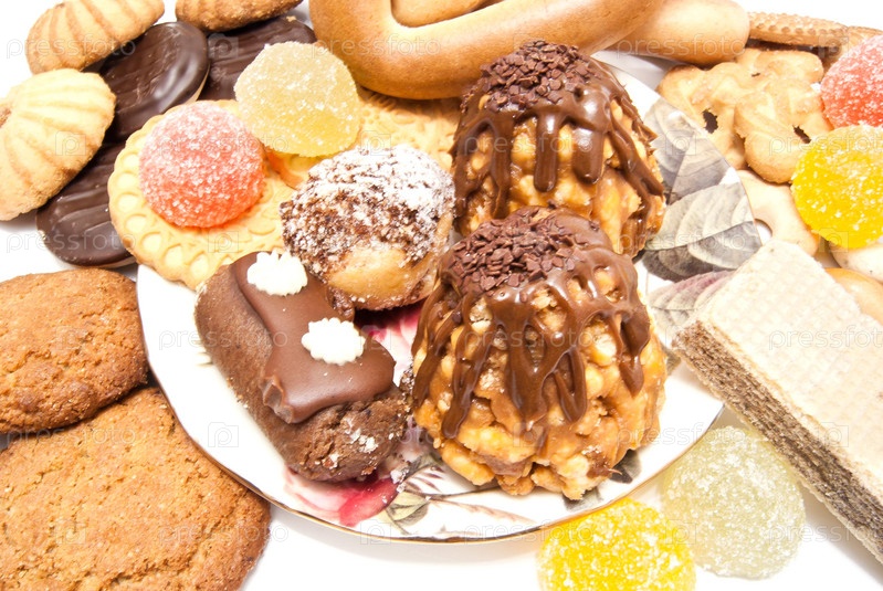 Разнообразные сладости на белом фоне